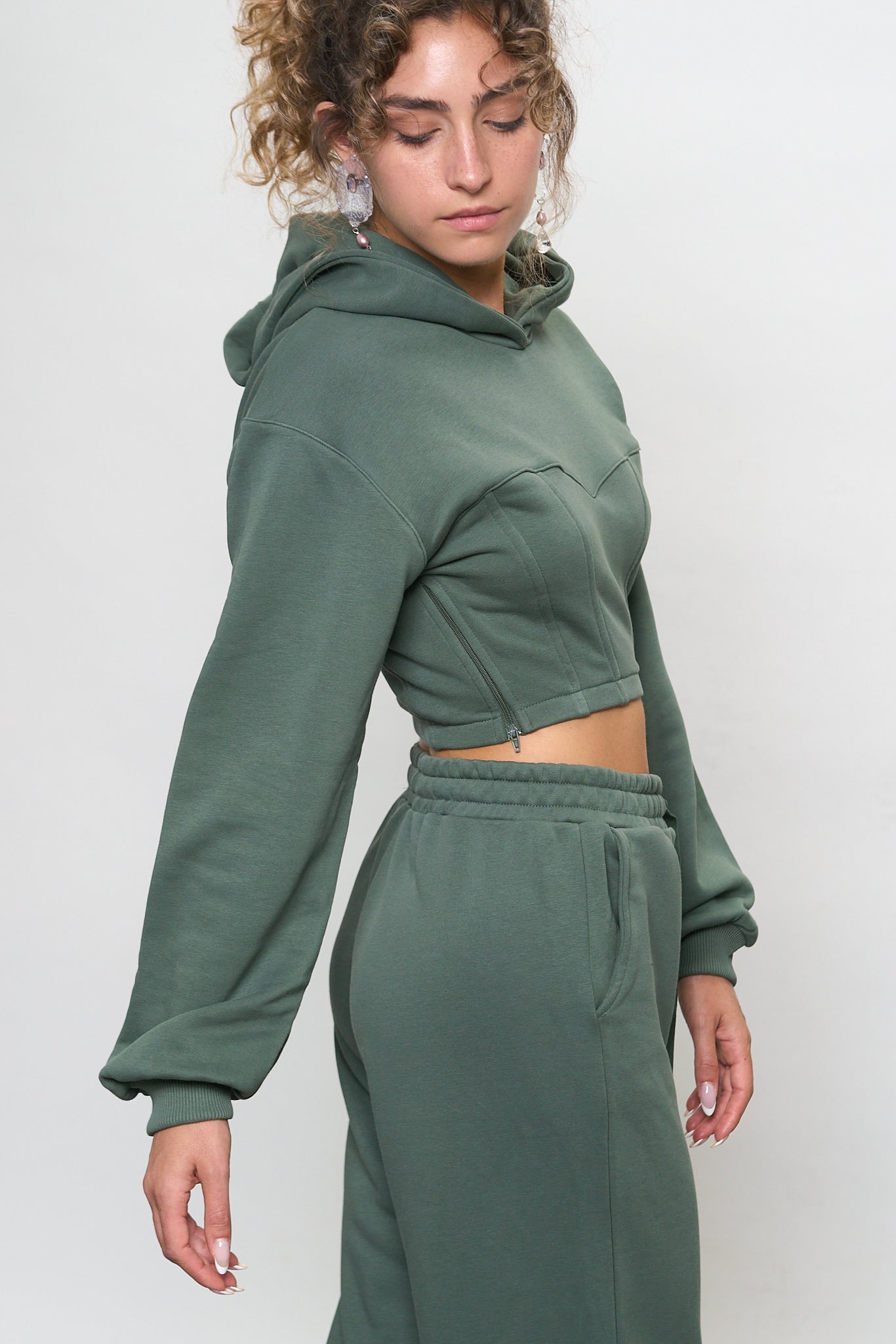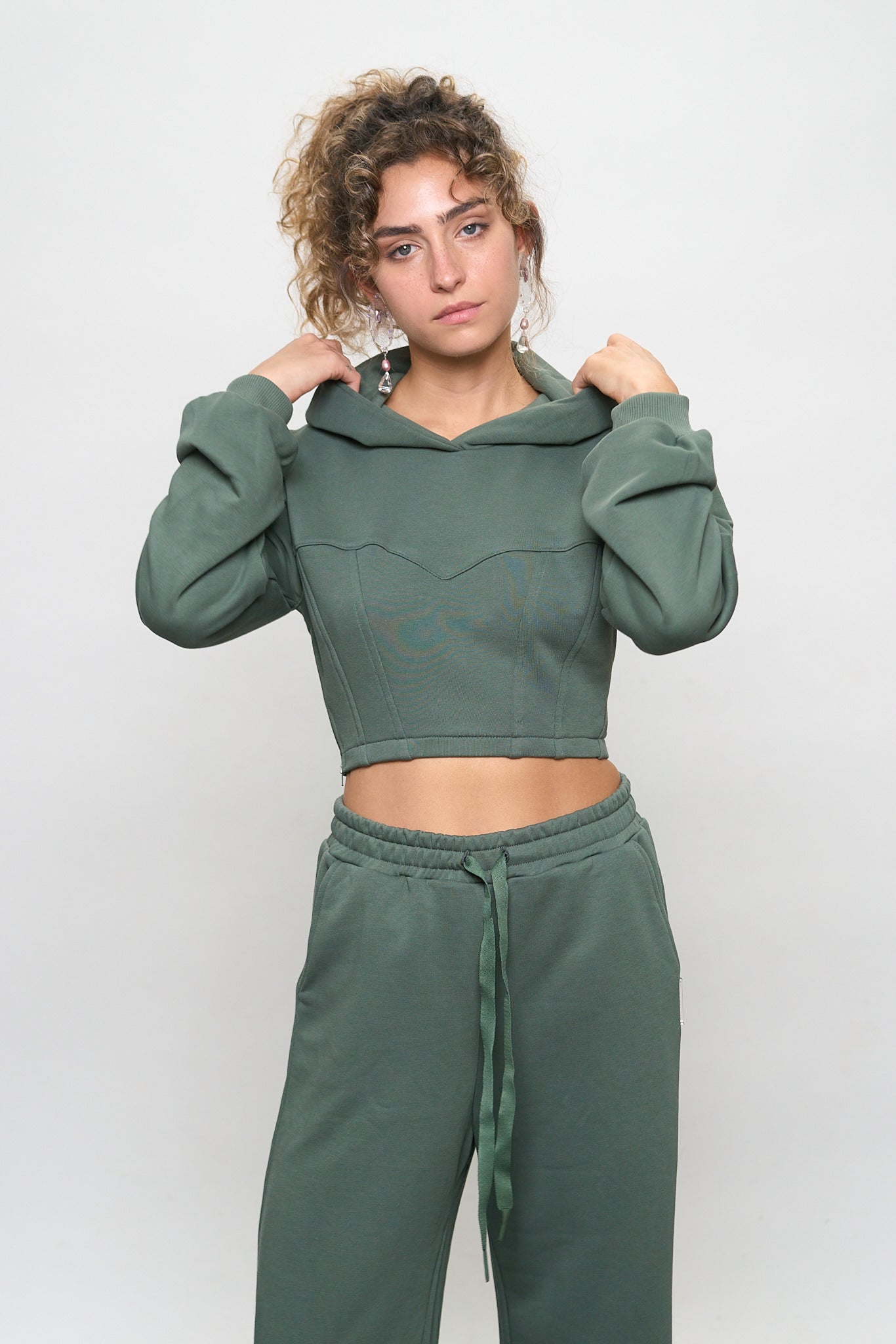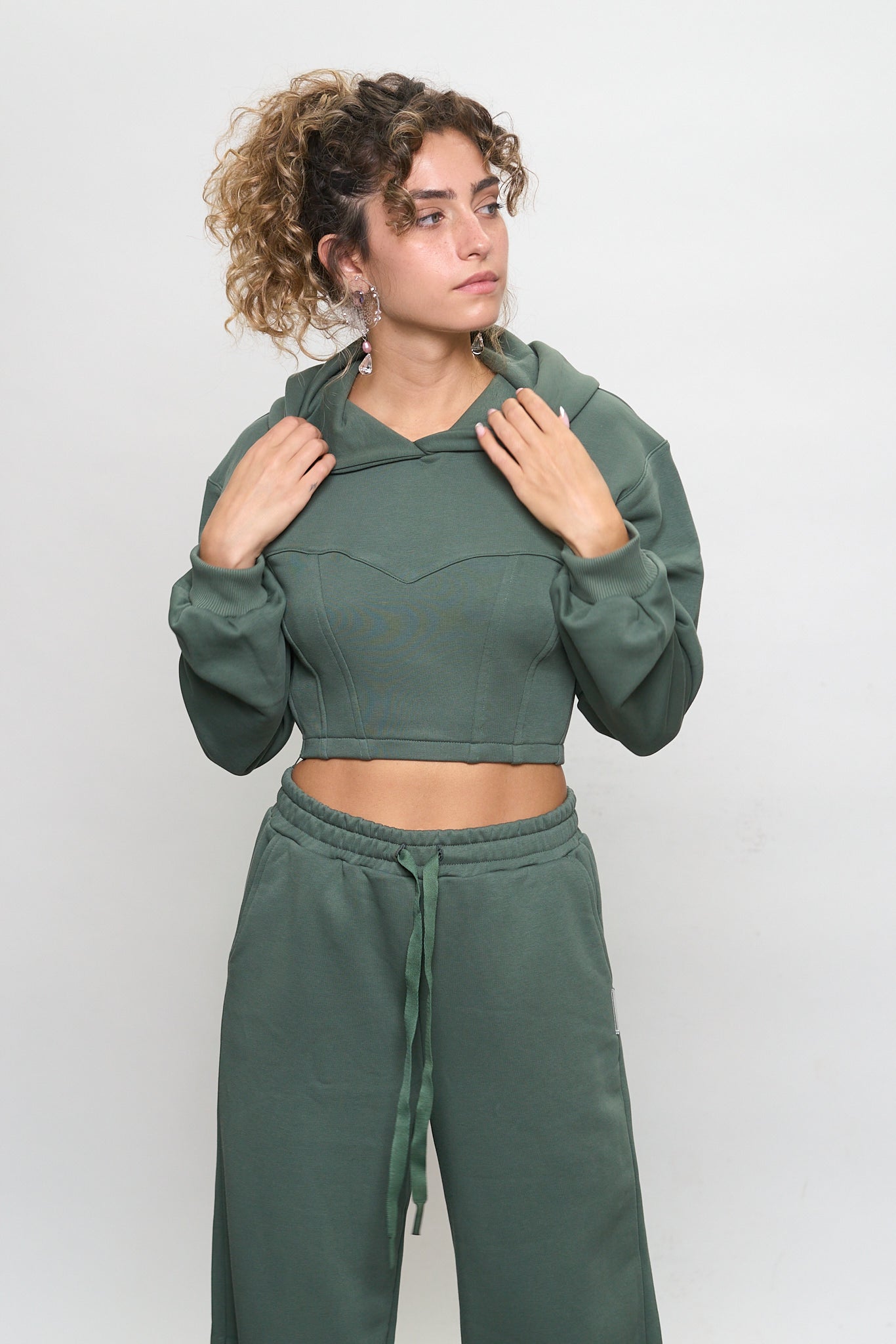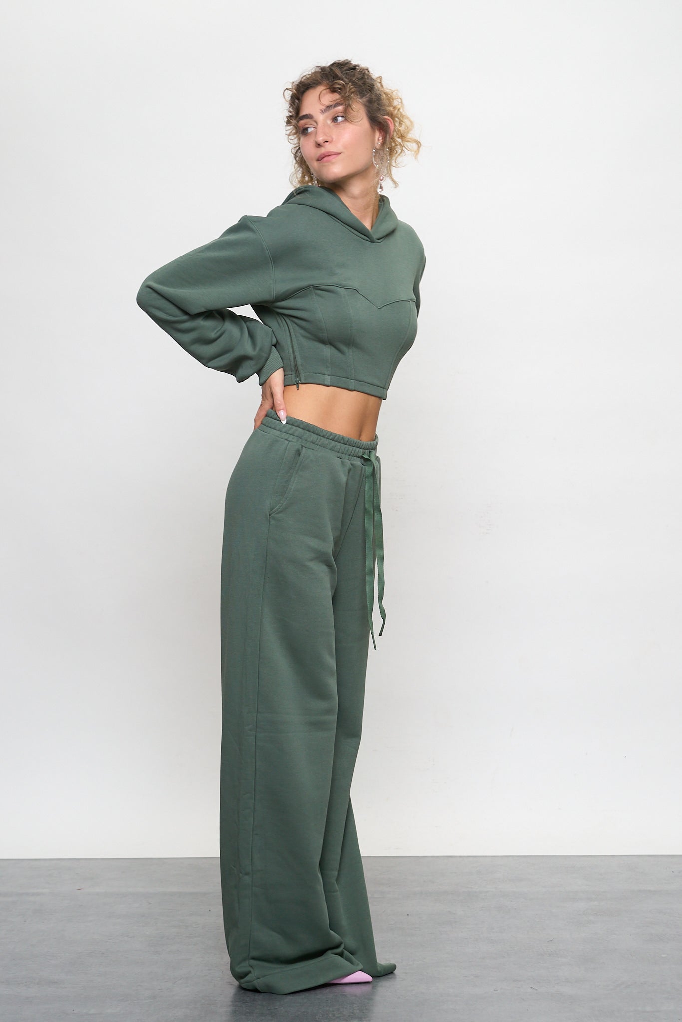 The 'leaves' sweatshirt is made of a comfortable and soft cotton fabric with a high-cut rubber that emphasizes and flatters the waistline. Designed to compliment any structure.