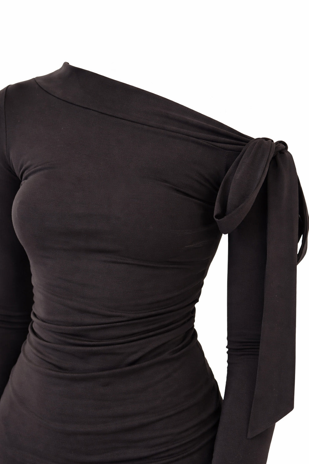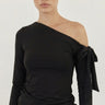 A clean and fluid asymmetric long-sleeve top with a soft drape and a sculpting fit. Designed with an off-shoulder neckline and a subtle tie detail that adds movement and elegance without effort. Minimal yet expressive, it sits perfectly on the body and elevates any look with quiet confidence.